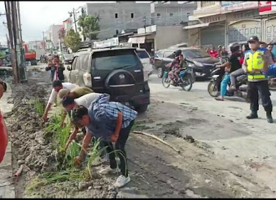 | Ket. Foto : Aksi Tanam Padi di kubangan lumpur dari pengorekan drainese proyek di jalan Denai. ( Red/ rilis) |